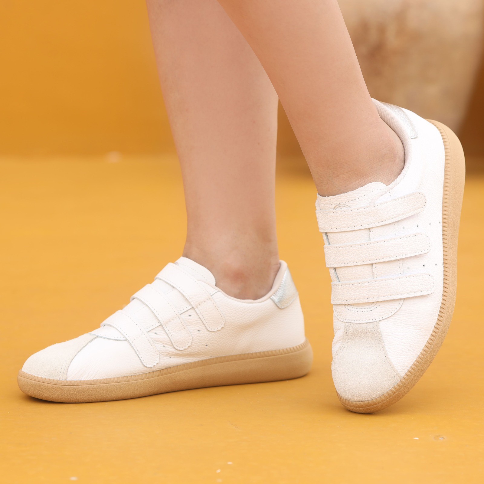 Tênis cabedal em couro camurça gelo, relax catalano branco e floter silver fechamento fecho flex. O modelo possui tecnologia Memória Permanente, com material de capacidade de retorno e mantêm o formato dos seus pés na palmilha.
